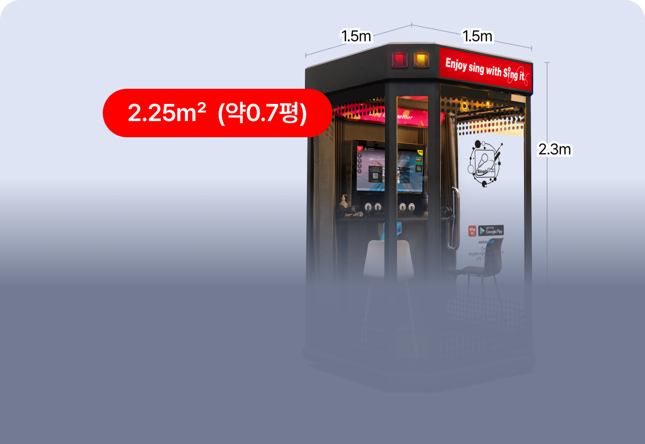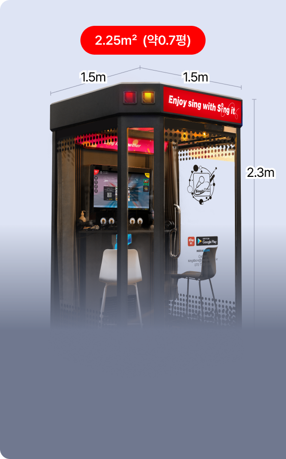 ICT규제샌드박스 통과한 실증특례 제품으로 기존 건축물 용도 및 시설 규제 등 복잡한 노래연습장의 규제 면제, 별도 인테리어 투자 없이 좁은곳에서도 설치 가능 (2.25㎡_0.7평)